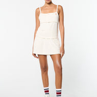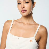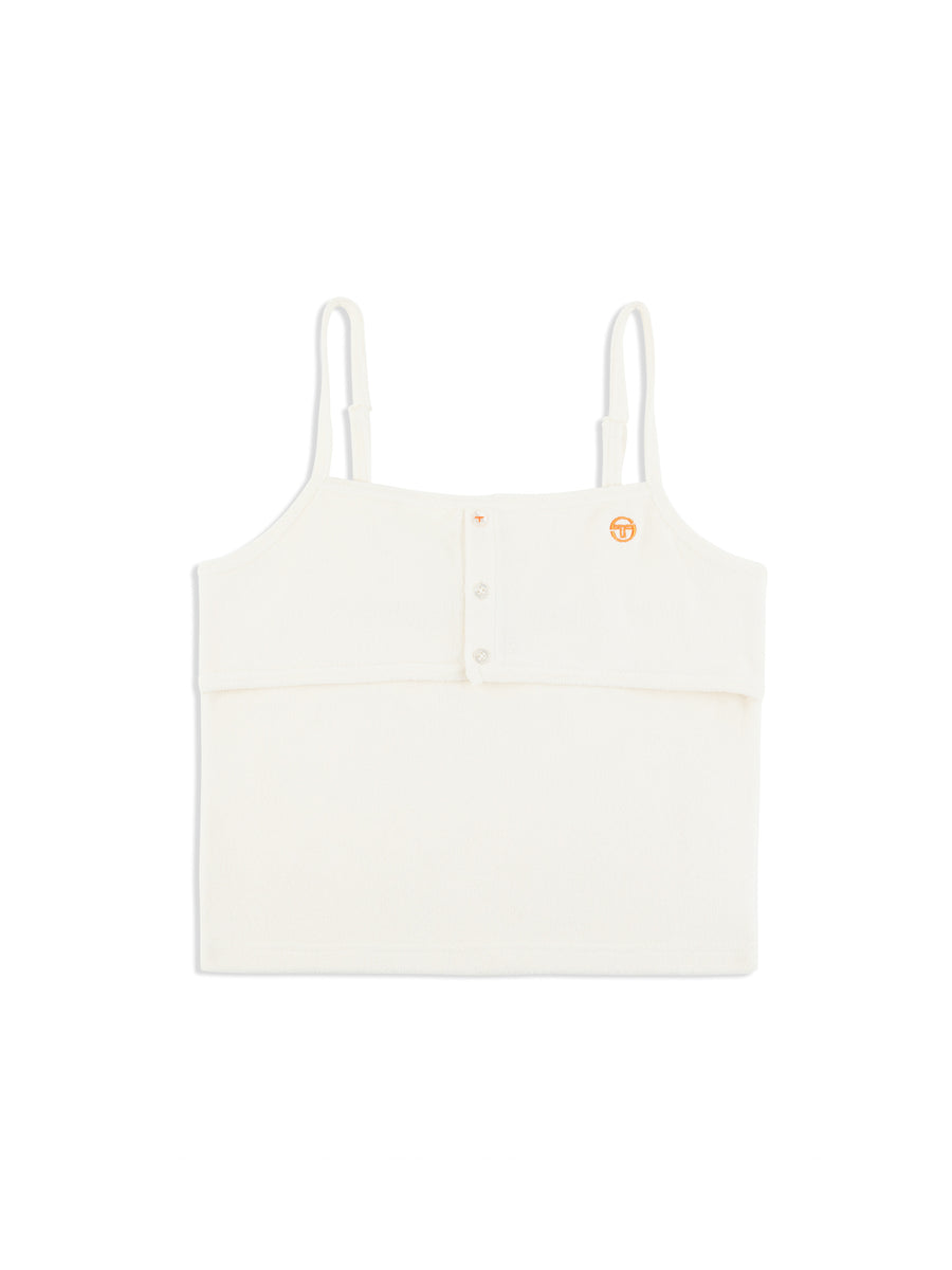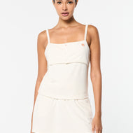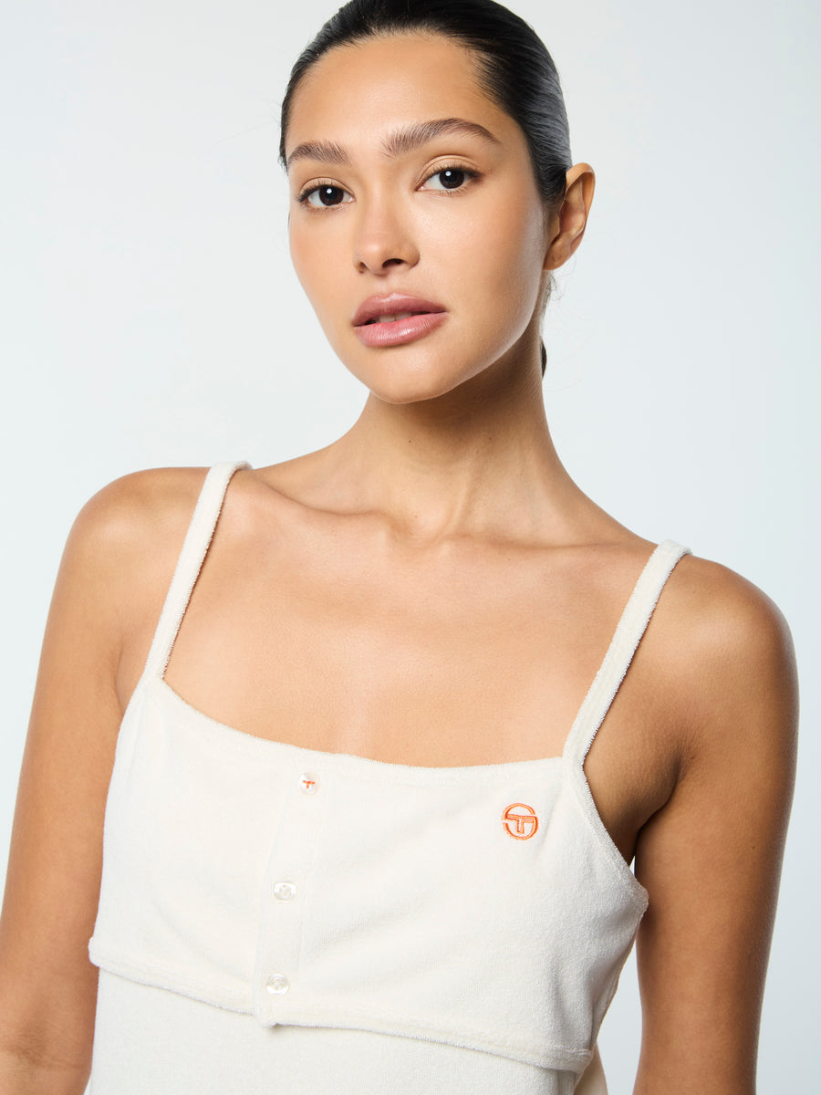 Perfect for summer beach trips, sports activities, or city strolls. The Edda Tank Top is crafted from super soft terry toweling fabric in a cropped cut with adjustable spaghetti straps. Featuring a buttoned overlay chest panel for added support, this casual tank is an easy-to-wear wardrobe staple.Pair with the Edda Skirt for the full fit. (Sold separately)