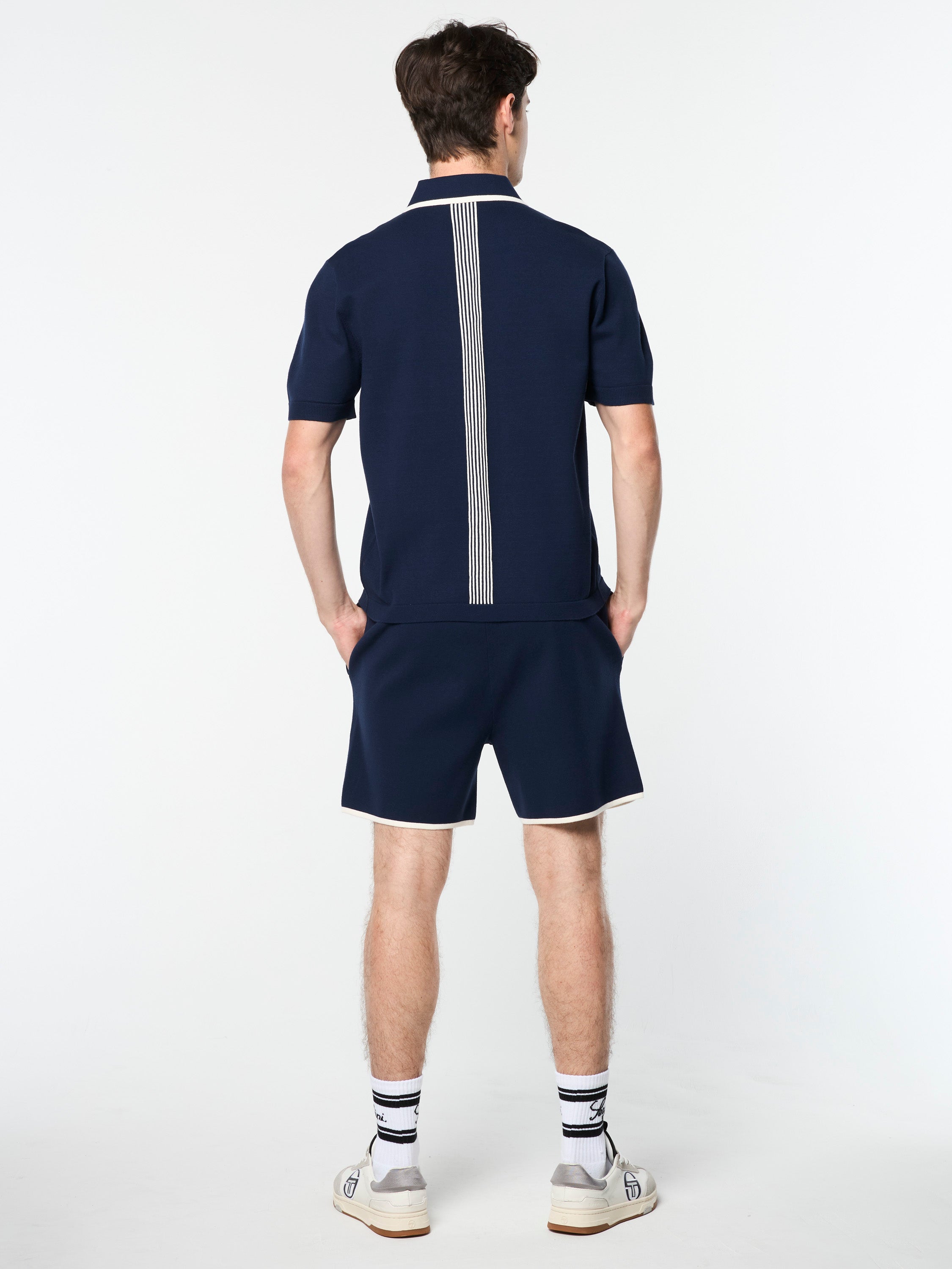 Our elevated Enzo Knit Polo is artfully crafted from high-quality Athena yarn that's breathable, moisture-wicking, and exceptionally soft to the touch. Designed with exquisite attention to detail, this premium polo features contrast tipping stripes at the collar and chest pocket, while intarsia knit pinstriping runs down the center back.Pair with the Enzo Knit Shorts for the full fit. (Sold separately)