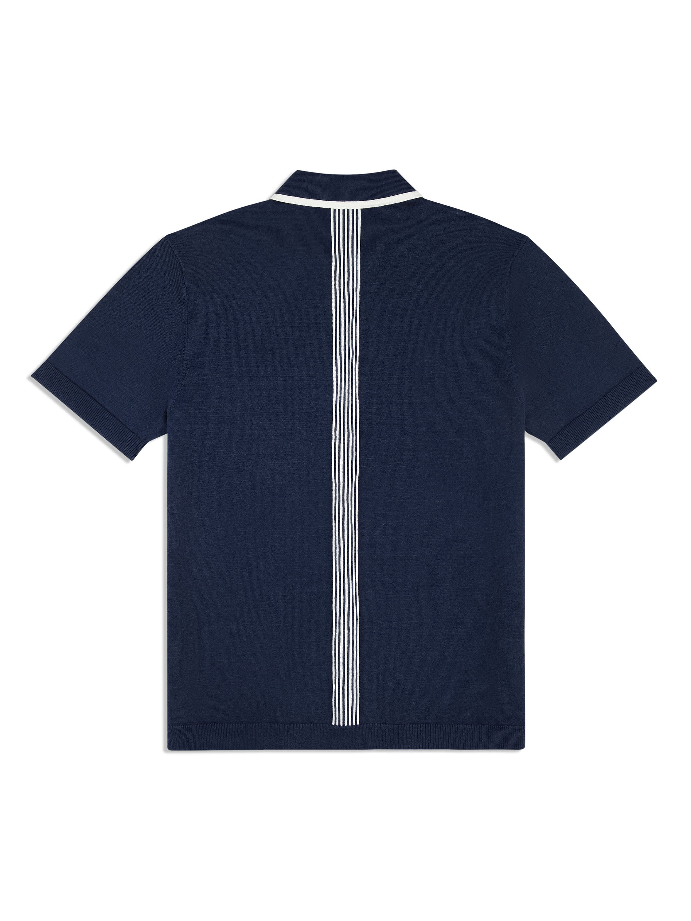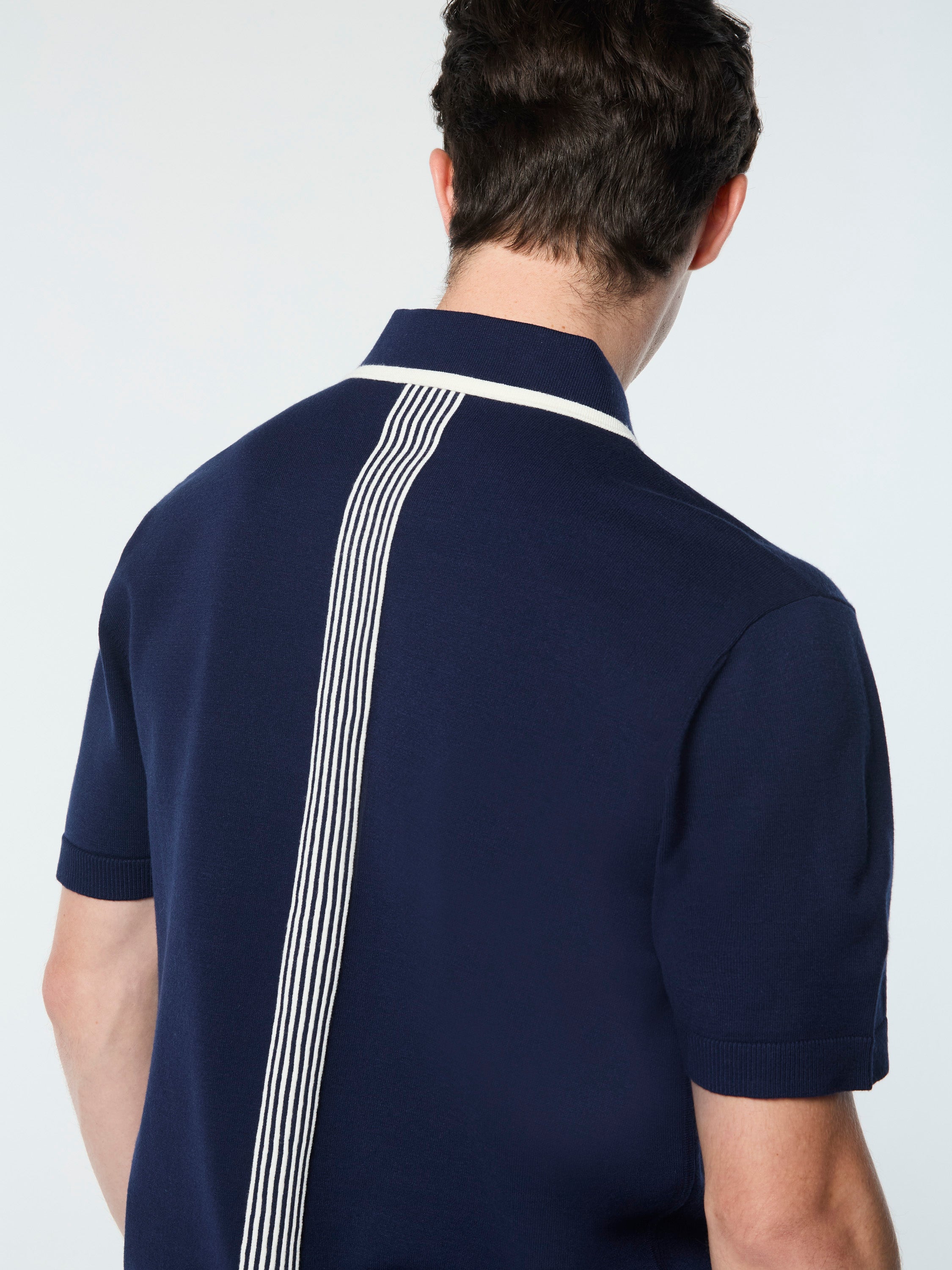 - Rib-knit polo collar w/ intarsia knit tipping stripe