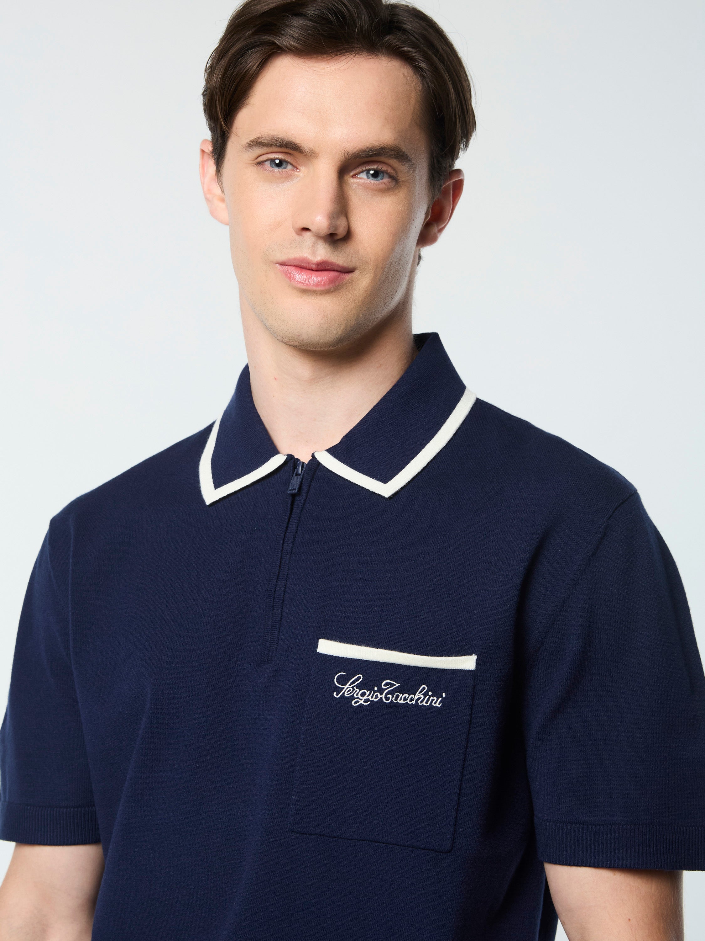 - Embroidered Sergio Tacchini script logo and tipping stripe at left chest pocket