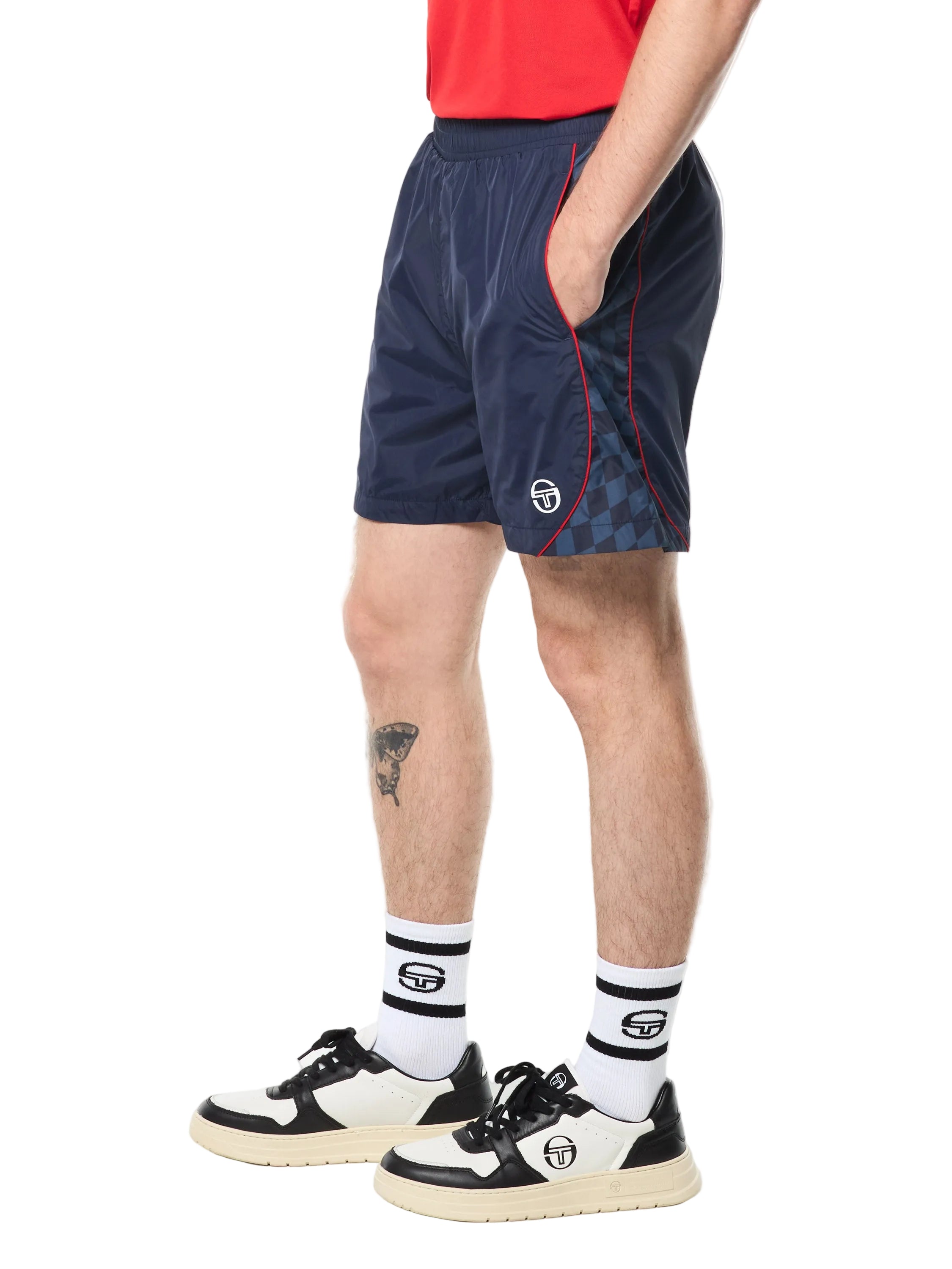- Tonal racing checkered pattern at side panels with contrast piping accents