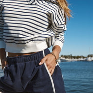 Set sail in the Marina Short, crafted from super-soft French terry cotton with maritime striping at the side panels for maximum comfort with a nautical vibe. Topped with a custom-fit elastic waistband, these seaside-inspired shorts are finished with contrast binding at the rounded dolphin hem.Pair with the Marina Crew Neck & Sailor Collar Sweatshirt for the full fit. (Sold separately)