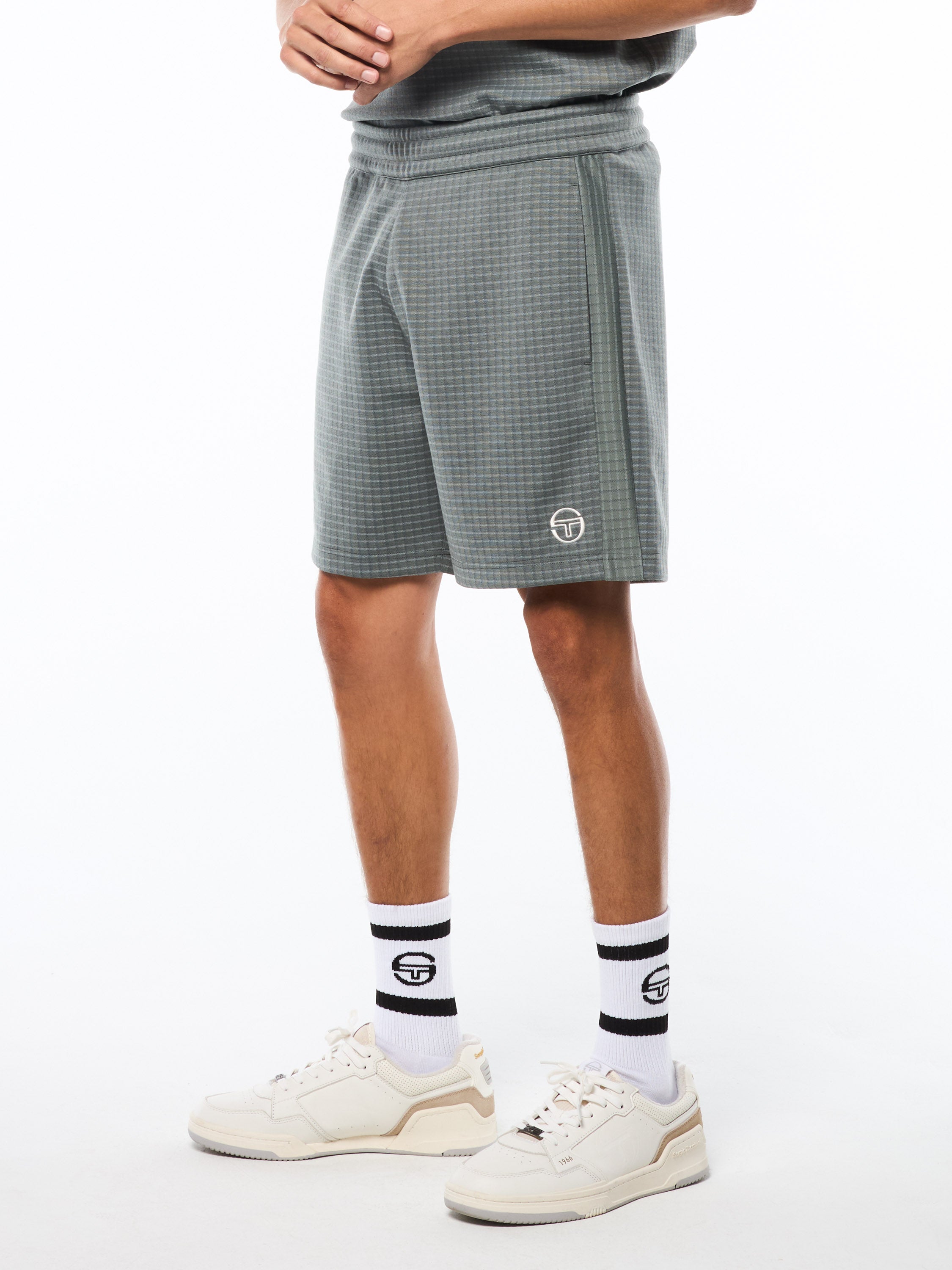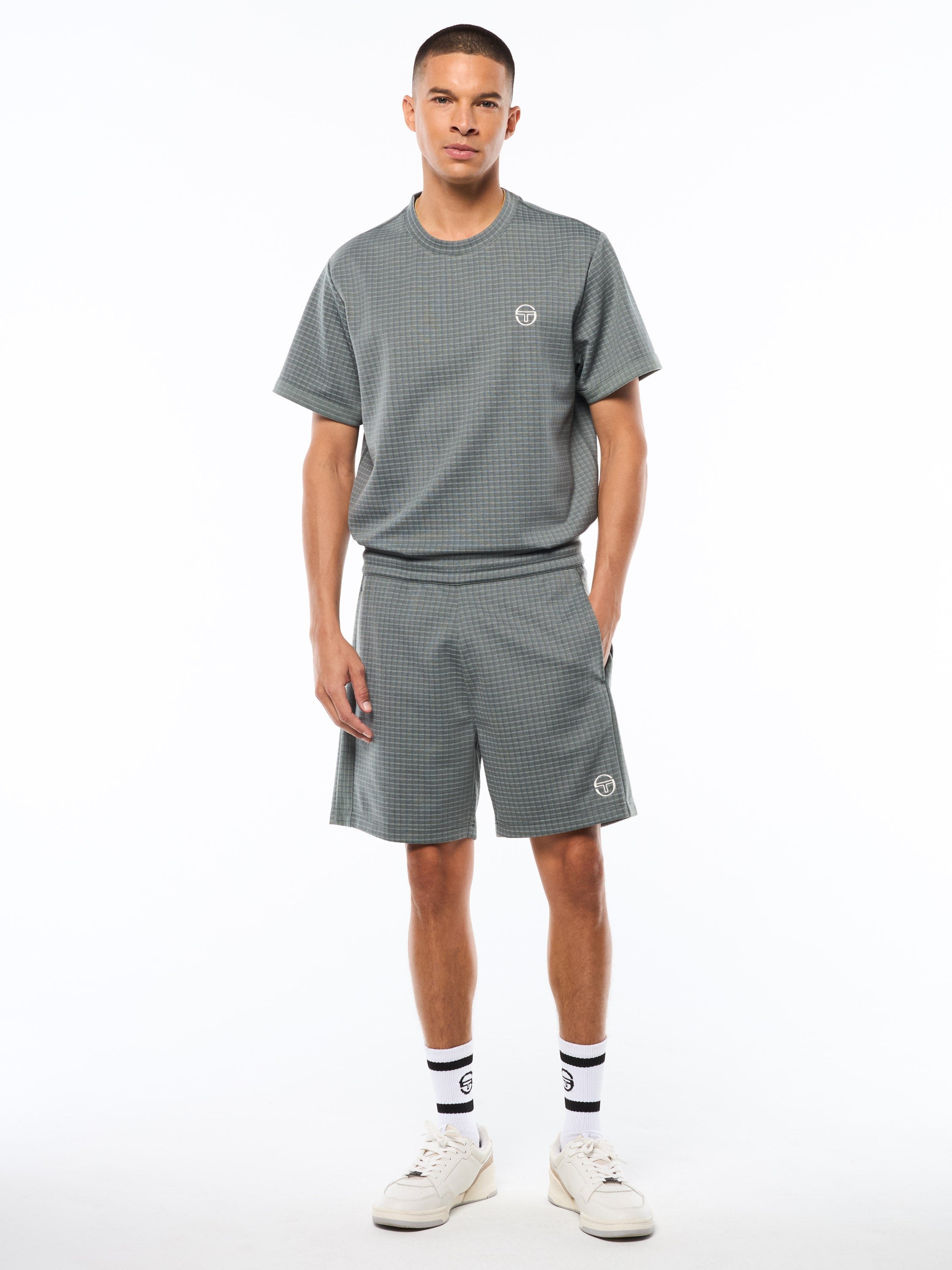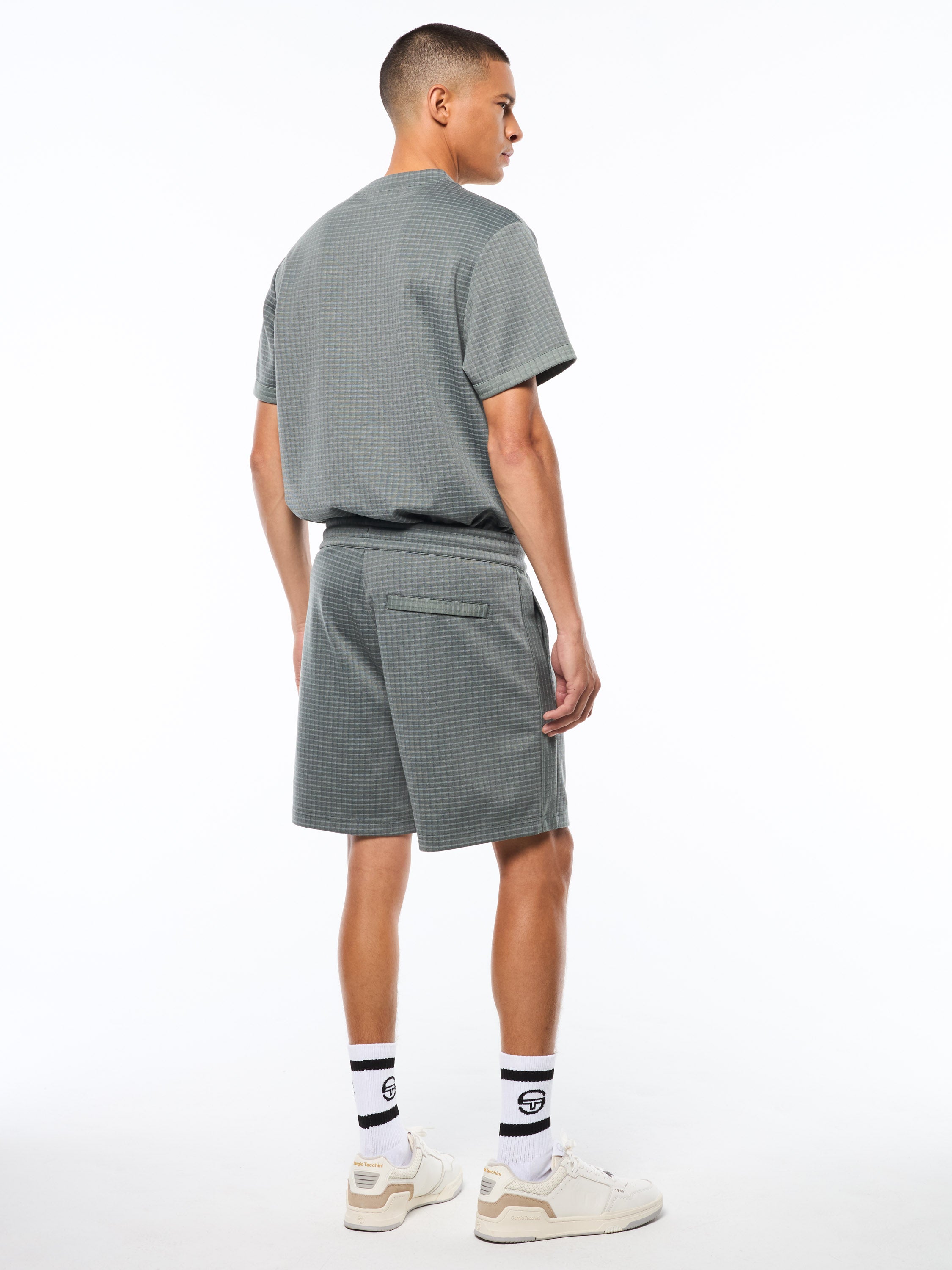 Rooted in Sergio Tacchini's sport heritage, the Rete Short delivers an elevated take on everyday comfort. Made from crafted thick jacquard fabric with a touch of stretch, this short features a clean silhouette finished with allover check patterning for a refined, modern look. Complete with subtle Tacchini branding and an easy elastic waist for all-day wear, it's a versatile warm-weather essential on or off the court.