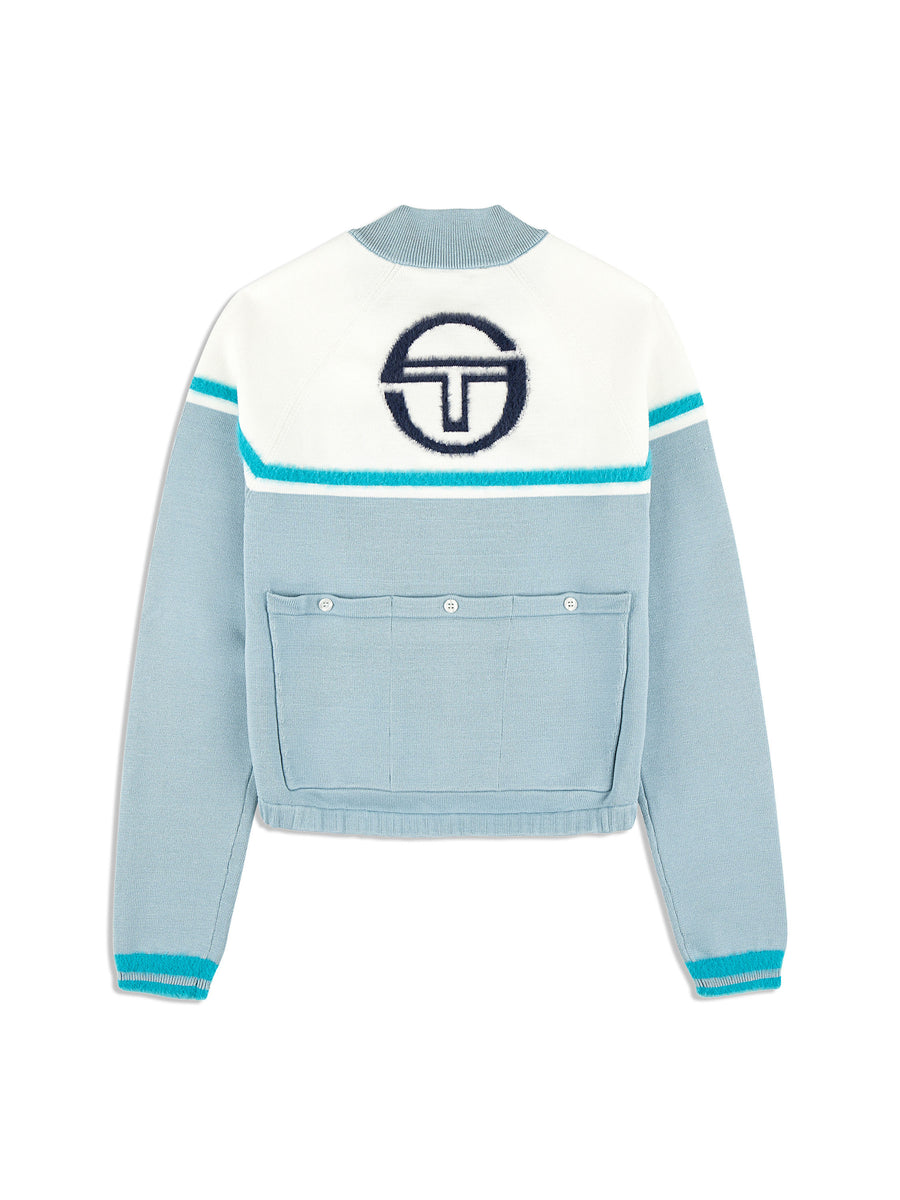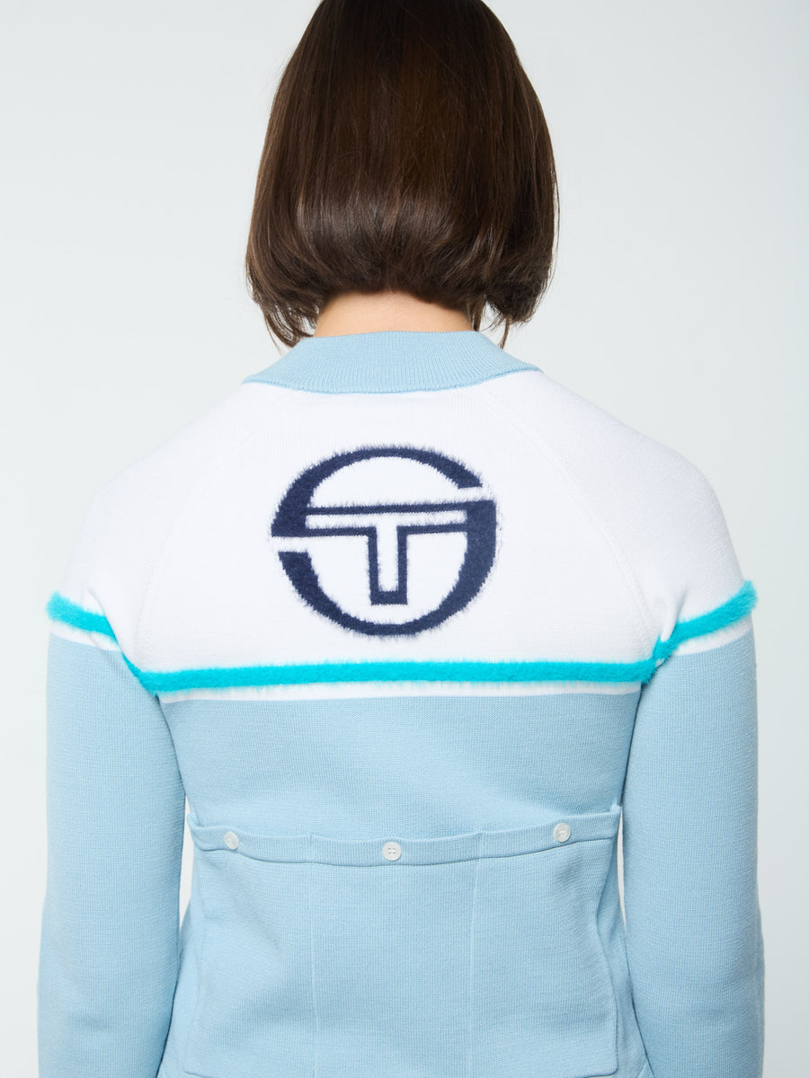 Designed with exquisite attention to detail, the Ruota Cycling Jersey is crafted from premium birds-eye knit fabric that's lightweight, breathable, and exceptionally soft to the touch. Featuring custom Intarsia knit artwork and striping details in fuzzy yarn for a tactile finish, this color-blocked zip-up jersey is finished with classic cycling pockets at the back.
