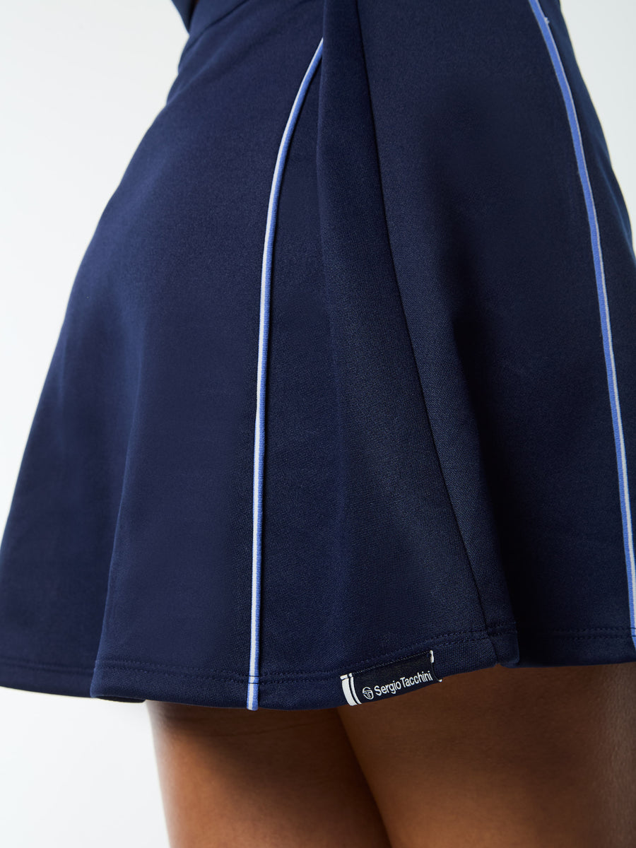 A sophisticated spin on a court classic, the Terina Skirt is crafted from premium double-face knit fabric for a structured drape and elevated feel. Tailored with princess seams and contrast piping for a flattering, sculpted silhouette, this piece is complete with a sleek snap-button and zip closure at the side for a streamlined look. From post-match hangs to city strolls, the Terina is your go-to for sporty refinement.