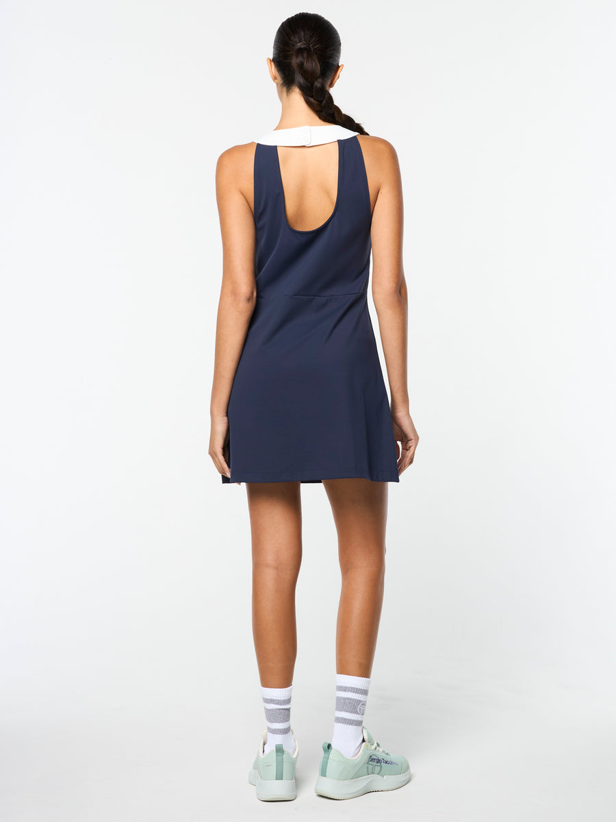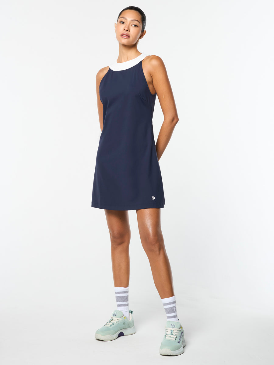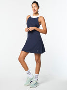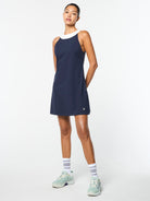 Channel your inner tennis pro with the Tessa Dress, crafted from buttery-soft performance stretch fabric to keep you moving freely and comfortably when practice heats up. Featuring a contrast neckband and scoop back for a flattering fit, this elevated athleisure dress is finished with an 'ST' monogram at the hem.