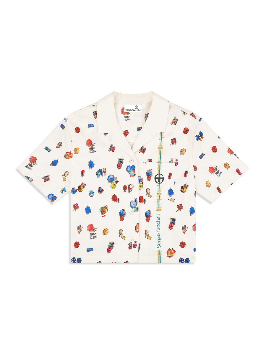 Our Women's Tosca Shirt is crafted from a luxurious Tencel-blend stretch fabric with a satin-like finish that's exceptionally soft and smooth to the touch. Perfect for warmer weather, this leisure resort button-up features an all-over Mediterranean beach scene, casual camp collar, and a water droplet silicone 'ST' monogram at the chest pocket for a seaside vibe.Pair with the Women's Tosca Short for the full fit. (Sold separately)