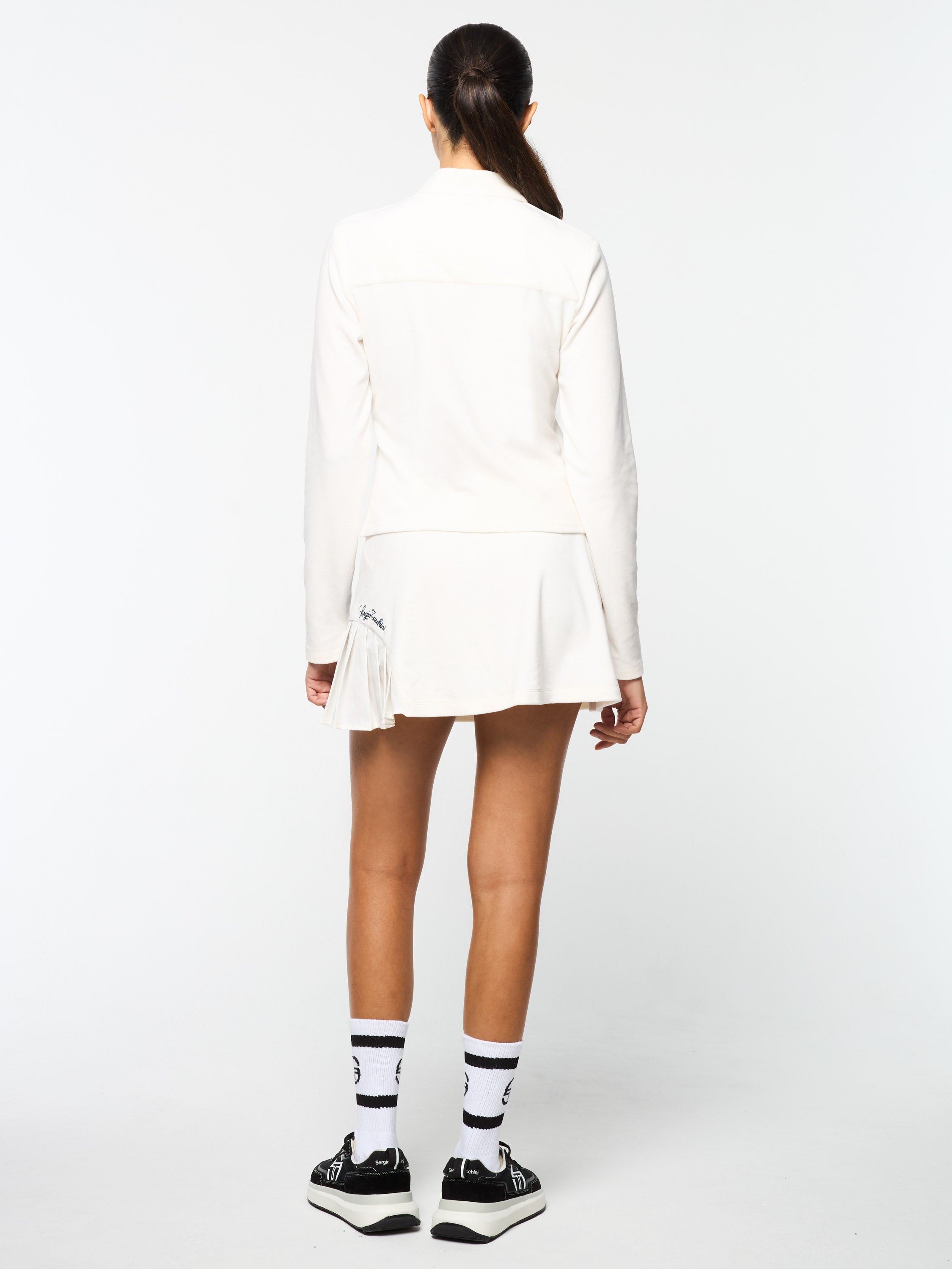 Crafted from ultra-plush velour, the Veneto Long Sleeve Polo features an embroidered Sergio Tacchini script logo at the left chest for a playful twist on varsity athletics and cheerleader fashion. A comfy wardrobe staple, this luxe polo is part of our seasonal "New Ivy" capsule—a contemporary take on collegiate prep aesthetics.Pair with the Veneto Velour Mini Skirt for the full fit. (Sold separately)