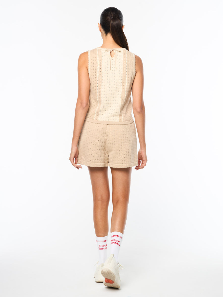 A luxurious take on vintage resort leisurewear, the Zola Knit Top is crafted from premium high-twist cotton yarn using an airy open pointelle-knit technique that's lightweight, breathable, and exceptionally soft to the touch. Perfect for summertime vacations and beach outings, this elevated top features striping accents at the body and scalloped edge detailing at the trims.Pair with the Zola Knit Short for the full fit. (Sold separately)